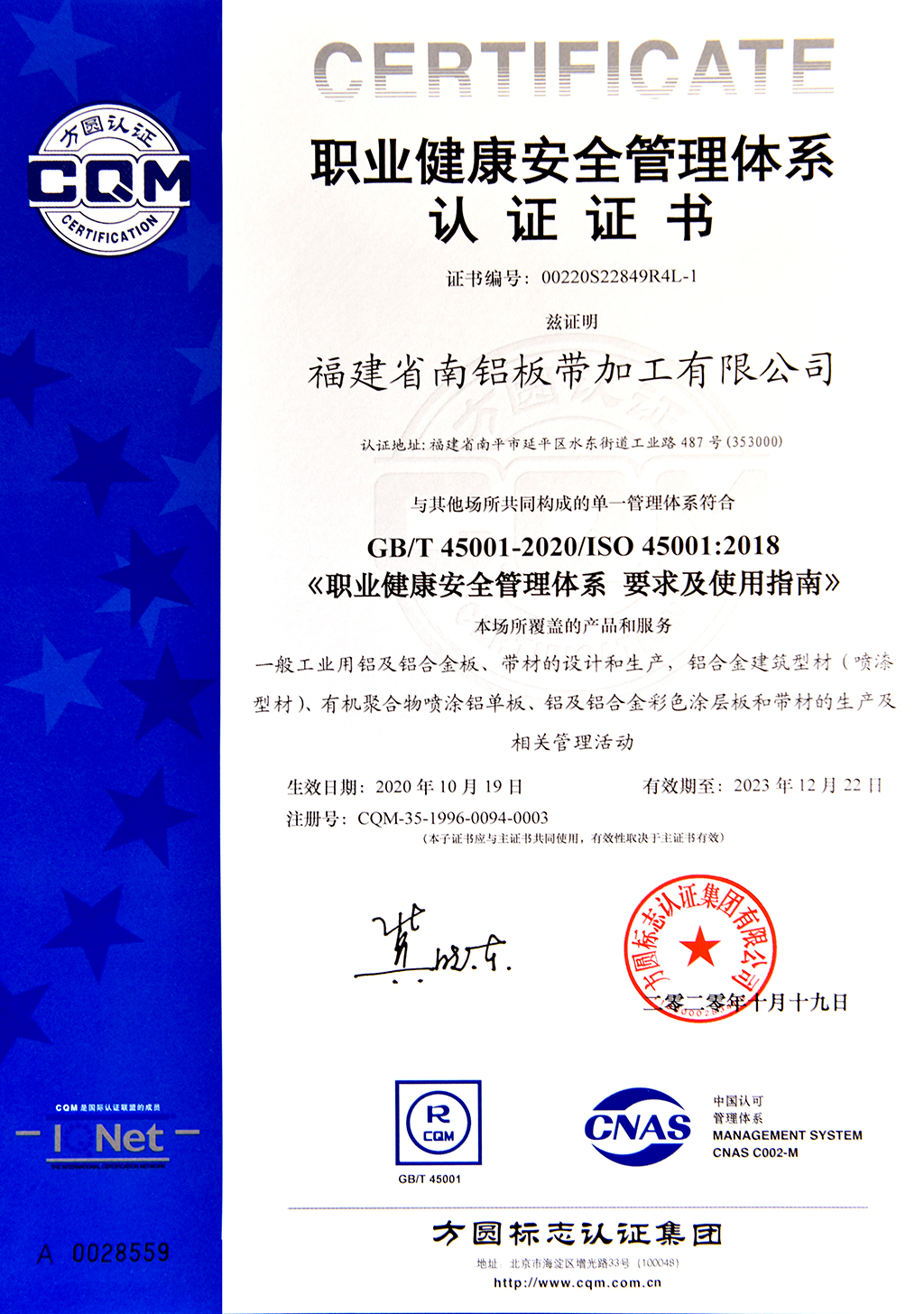 職業(yè)健康安全管理體系認證證書--南鋁板帶